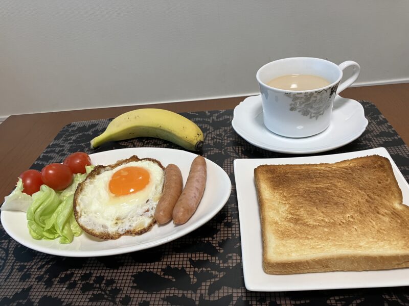 トースト/目玉焼き/ウインナー/レタス/ミニトマト/バナナ/カフェオレ(無糖)